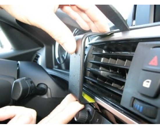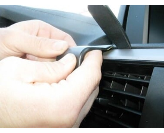 1. Druk op het dunne uiteinde van de gesloten gap opener in de opening tussen het frame rond de ventilatieopening en het dashboard, om de opening te vergroten. Gebruik het bijgevoegde alcoholkussen om het gebied waar de ProClip moet worden geïnstalleerd, schoon te maken. Pel de plakbanddeksel op de ProClip. Druk de schuine rand op het onderste deel van de ProClip in de opening tussen het frame rondom de ventilatieopening en het bedieningspaneel.