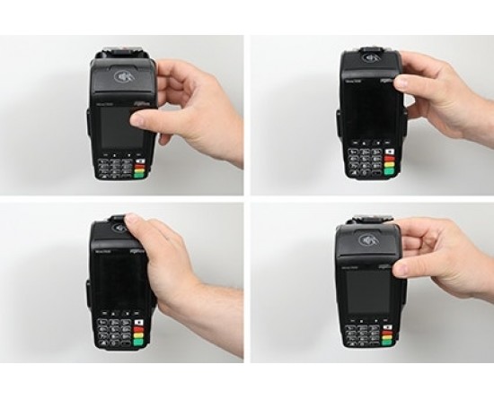3. Om het apparaat in de houder te plaatsen: Plaats het onderste deel van het apparaat in de houder. Druk de bovenkant van het apparaat naar voren op zijn plaats in de houder. Het apparaat uit de houder verwijderen: Druk het bovenste deel van de houder naar voren. Wanneer het apparaat is vrijgemaakt, tilt u het omhoog uit de houder.