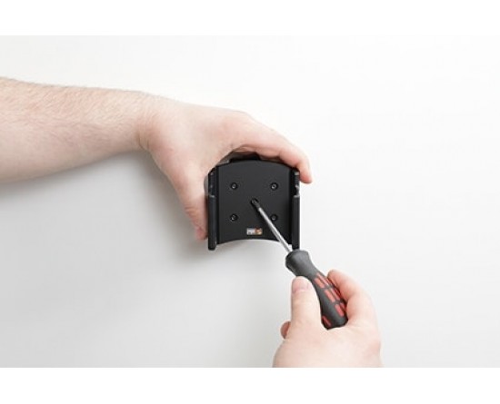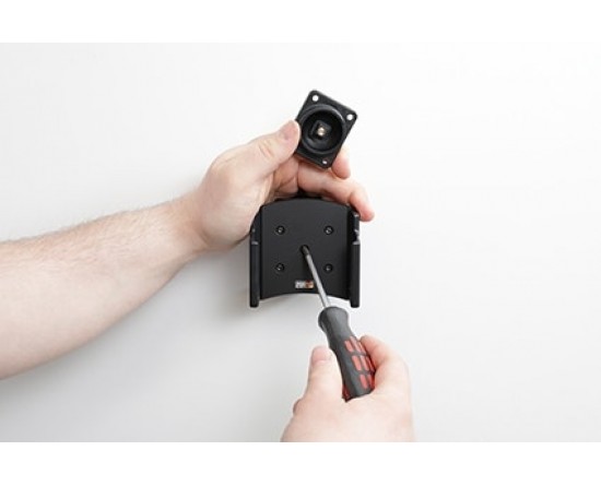 3. Plaats de houder over de bevestigingsplaat zodat de schroef in het gat in de swivel (kantel- en draaibare adapter) past en schroef deze op zijn plaats. Draai de schroef vast zodat de houder stevig op zijn plaats zit, maar toch kan worden afgesteld.