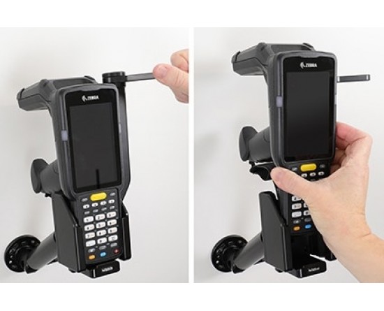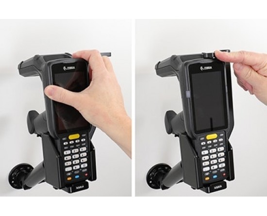 Het is eenvoudig om de PDA in de houder te plaatsen en mee te nemen bij het verlaten van het voertuig. U kunt bijvoorbeeld een oplaadkabel op het apparaat aansluiten terwijl u in de houder zit. Bevestig op een voetstukbevestiging.