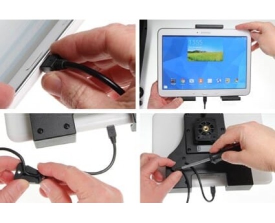 Lees alle instructies en kijk naar de foto's voordat u de houder bevestigt. 1. Sluit de oplaadkabel aan op het apparaat. Kies welke manier u uw apparaat in de houder wilt gebruiken. Druk de oplaadkabel op zijn plaats in de meegeleverde kabelbevestiging en plaats de kabelbevestiging over de voorgeboorde gaten op de achterkant van de houder, kies richting/zijkant, afhankelijk van hoe u de kabel wilt laten draaien. Zorg ervoor dat de kabel lang genoeg is om op het apparaat te worden aangesloten. Schroef de kabelbevestiging op de houder met de meegeleverde schroeven.