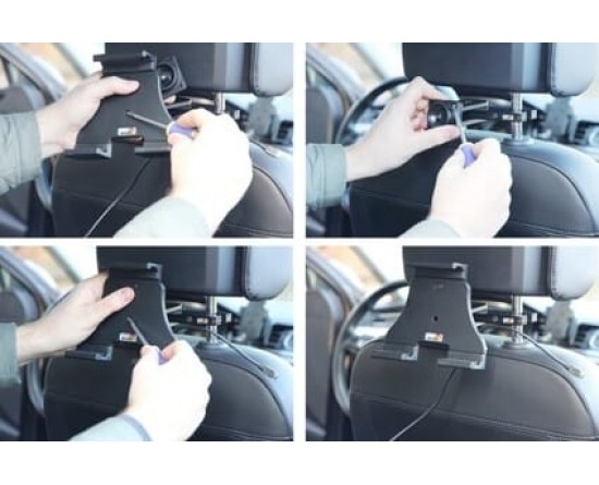 Lees alle instructies en kijk naar de foto's voordat u de houder bevestigt. 1. Sluit de oplaadkabel aan op het apparaat. Kies welke manier u uw apparaat in de houder wilt gebruiken. Druk de oplaadkabel op zijn plaats in de meegeleverde kabelbevestiging en plaats de kabelbevestiging over de voorgeboorde gaten op de achterkant van de houder, kies richting/zijkant, afhankelijk van hoe u de kabel wilt laten draaien. Zorg ervoor dat de kabel lang genoeg is om op het apparaat te worden aangesloten. Schroef de kabelbevestiging op de houder met de meegeleverde schroeven.