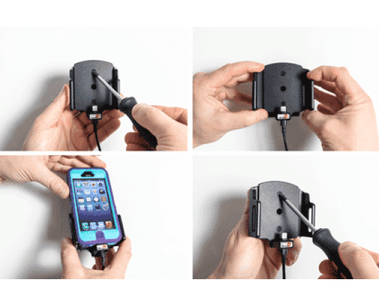 1. Om de houder voor uw apparaat aan te passen: Maak de schroeven aan de voorzijde van de houder los, zodat de zijkanten van de houders kunnen worden aangepast. Plaats het apparaat in de houder en druk de zijkanten tegen elkaar zodat het apparaat stevig op zijn plaats is. Draai de schroeven aan de voorzijde van de houder aan.