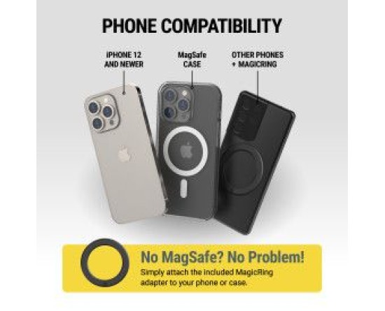 Holds iPhone models X, 11 & SE and Android phones using the included MagicRing® Adapter.