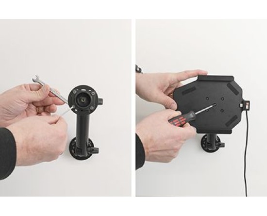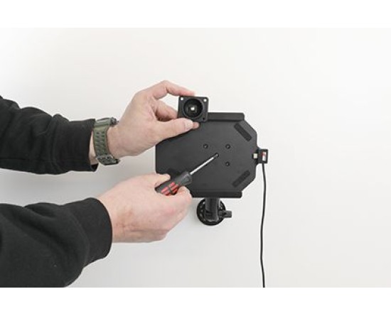 2. Plaats de bevestigingsplaat op de gewenste positie. Schroef de bevestigingsplaat met de meegeleverde schroeven op zijn plaats. Plaats de houder over de montageplaat zodat de schroef in het gat in de tilt swivel (kantel- en draaibare adapter) past. Draai de schroef vast totdat de houder stevig op zijn plaats zit, maar nog steeds kan worden aangepast.