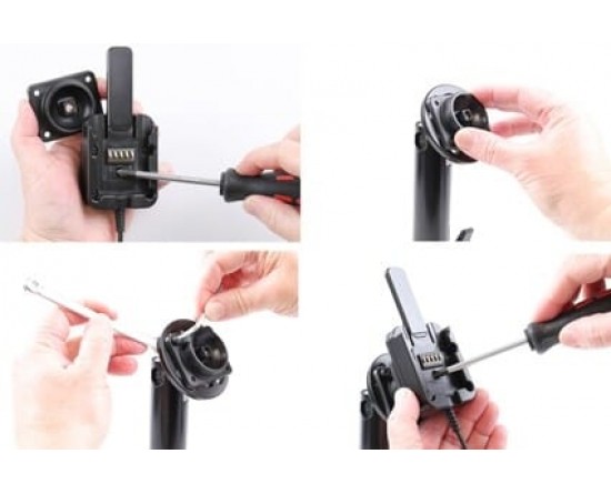 Het apparaat zit stevig op zijn plaats in de sleeve en kan niet worden verwijderd zonder de schroeven los te maken. Je hebt volledige toegang tot de camera en alle knoppen wanneer het apparaat in de sleeve zit. Voor vaste installatie. 12/24 V. Het product is e-goedgekeurd. Sluit de voedingskabel aan met een 2 A zekering. Professionele installatie aanbevolen. Uitgerust met een swivel (kantel- en draaibare adapter) zodat u gemakkelijk schakelen tussen portret en landschap modus. Gemaakt van zwart ABS- och Acetal plastic. Gemaakt in Zweden. Bevestig op een Pedestal Mount of extra sterkte montage platform.