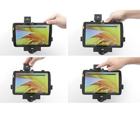 2. Om het apparaat in de houder te plaatsen: Plaats het onderste deel van het apparaat in de houder. Draai/druk het bovenste deel van het apparaat naar voren zodat het vastklikt in de houder. Druk het vergrendelingsblok naar beneden. Druk op de knop om te vergrendelen.