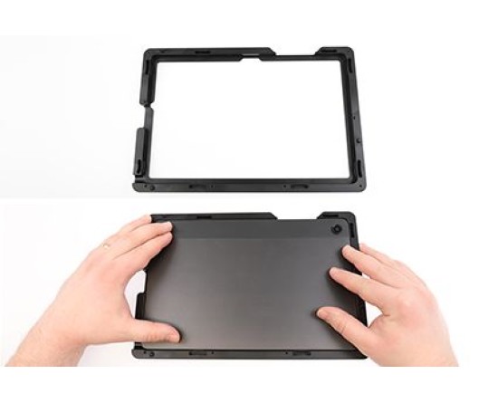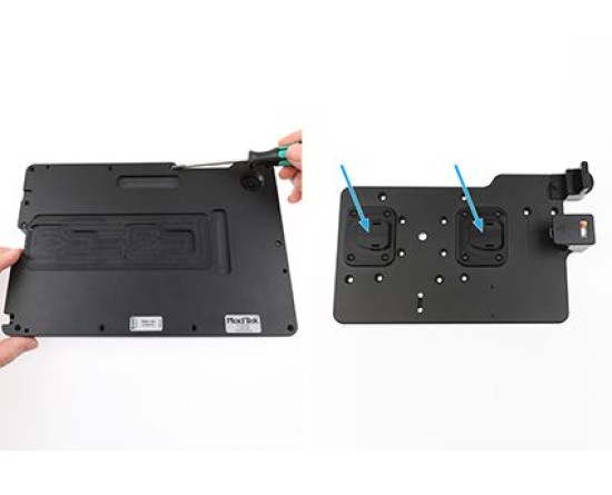 2. Plaats de achterplaat over de tablet en zet deze vast met de 10 meegeleverde T10 Torx-schroeven. De twee bevestigingspunten op het ModTek Dock (apart verkrijgbaar) worden gebruikt om de tablet uit te lijnen met de USB-C-connector om een perfecte uitlijning te garanderen en ervoor te zorgen dat de USB-C-verbinding met de tablet geen overmatige slijtage veroorzaakt.