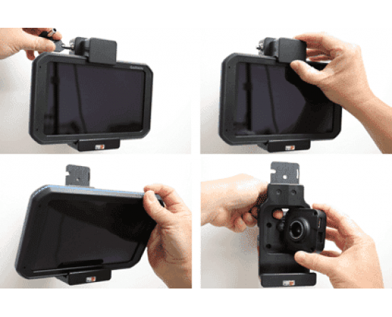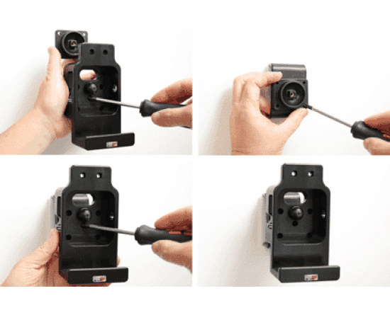 1. Maak de schroef los in het midden van de houder, zodat u de kantelbare bevestigingsplaat op de achterzijde kan verwijderen. Plaats de bevestigingsplaat op de gewenste positie. Schroef de bevestigingsplaat op zijn plaats met de meegeleverde schroeven. Plaats de houder over de bevestigingsplaat zodat de schroef in het gat in de tilt swivel (kantel- en draaibare adapter) past. Schroef de houder op de bevestigingsplaat. Draai de schroef aan zodat de houder stevig op zijn plaats is, maar nog steeds kan worden aangepast.
