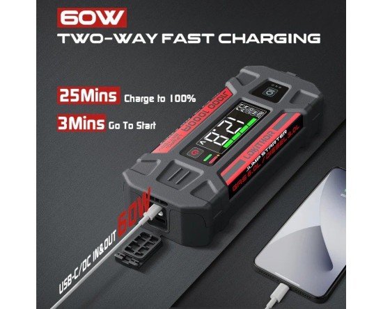 4. 60W two-way fast charging: Fully charged in just 25 minutes, and a 3-minute charge can jump-start your device. 60W power output effortlessly charges smartphones, tablets, laptops, wearable devices, and more. J1000 LiFePO4 power station jump starter provides up to 24 months of continuous power on a single full charge.