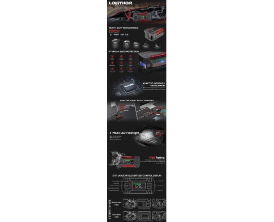 2. The battery cell and intelligent BMS battery system of this 1 000 amp LiFePO4 supersafe lithium jump starter provide dual safety measures, while the large screen displays voltage output, working status, and step-by-step instructions. With 9 types of protection, including spark-proof, mistake-proof, and reverse-polarity protection, you can confidently use the jump starter power bank without worrying about malfunctions such as short circuits or sparks.