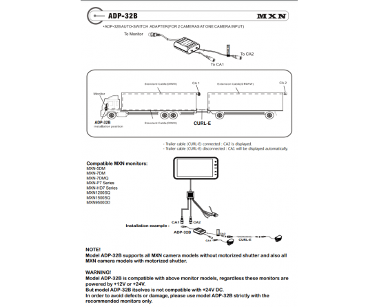 • AUTO-SWITCH ADAPTER WITH SOURCE DETECTION FOR TWO MXN CAMERAS, TO BE USED TOGETHER WITH A MXN TRAILERSET. MODEL ADP-32B DETECTS WHETHER THE CURL-E CABLE BETWEEN TRACTOR & TRAILER IS CONNECTED OR NOT. IF CONNECTED: CA2 IS DISPLAYED. IN CASE CURL-E DISCONNECTED: CA1 IS DISPLAYED.